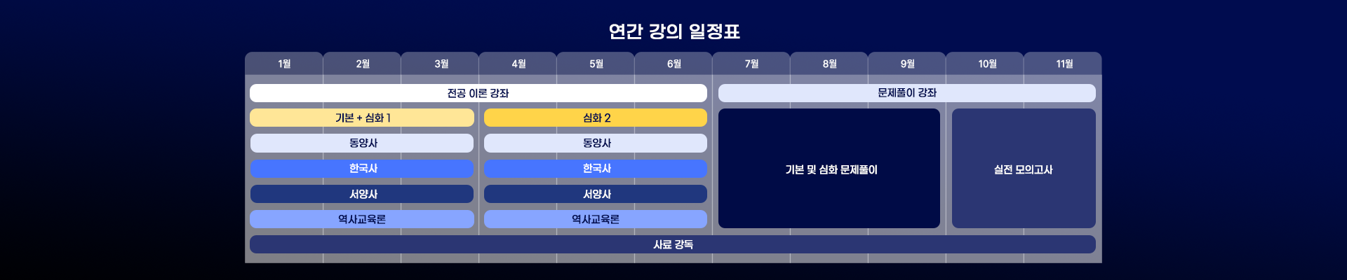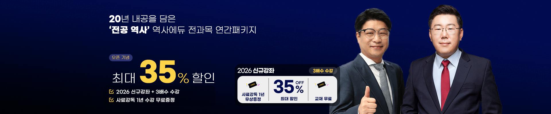 2) 이론 강좌를 바탕으로 한 기출 문제 및 아직 출제되지 않은 주제를 중심으로 한 문제 풀이 및 심화 정리 3) 주제별 1차 사료 정리 및 유형화 작업 결과물 제공 4) 동·서양 주제별·시기별 지도화 문제 풀이 5) 기본 및 심화1 강의 내용을 바탕으로 동형 문제에 적응하고 학습 내용 정리 6) 심화II 강의, 내용학 및 개정 교육과정을 반영한 심화문제 학습과 정리 7) 수강료 8주 66만원 |